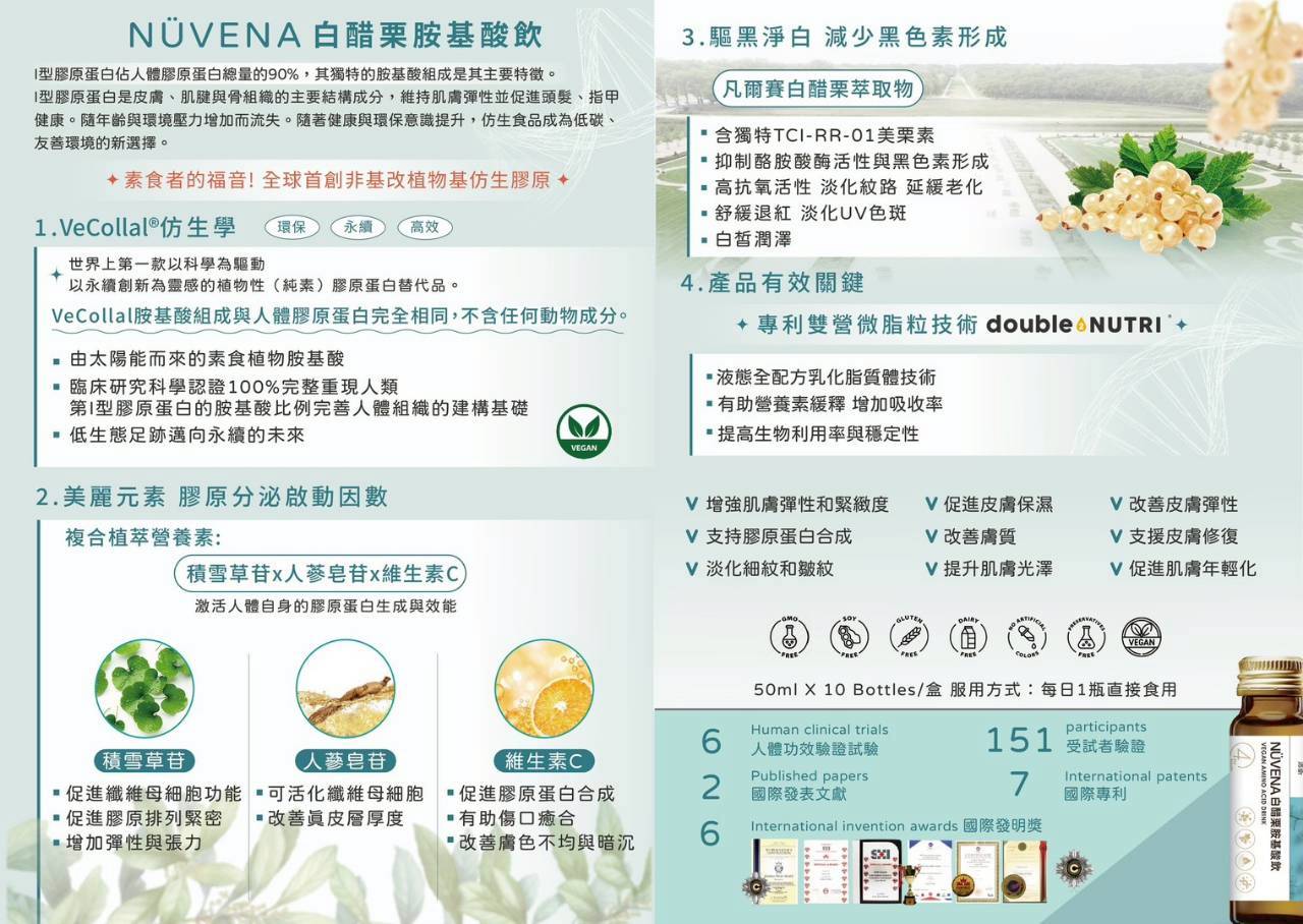• 專利素食第I型膠原蛋白 • 專利微脂粒包覆技術 • 精準協同基啟動因素 • 國際認證凡爾賽白醋栗配方 50ml X 10 Bottles/盒